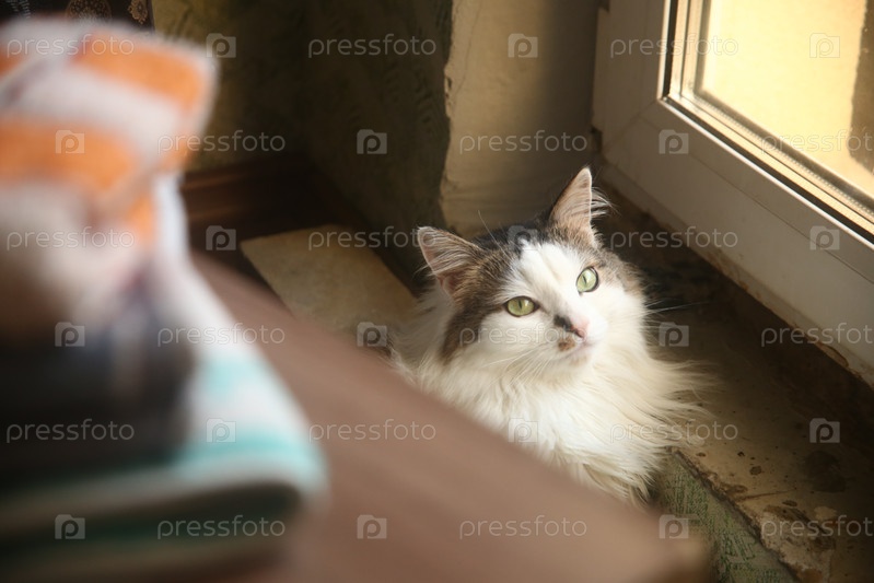 Махровые полотенца на столе и черно-белый кот в комнате