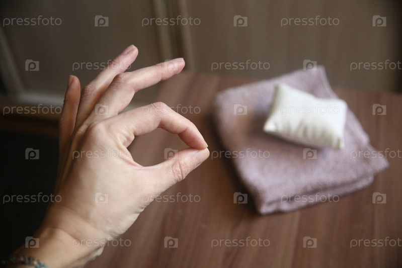 Маленькая подушка и полотенце на столе и женская рука, показывающая класс