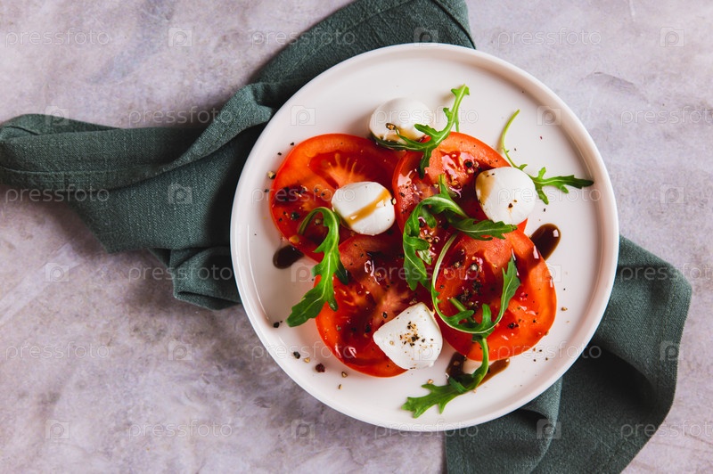 Закрытие средиземноморского салата капресе с аругулой на тарелке с видом на стол