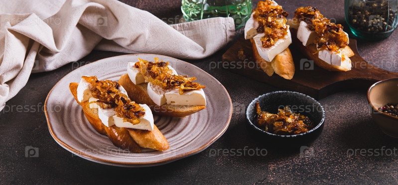 Закуски с бутербродами с сыром бри и карамельным луком на тарелке на столе веб-баннер