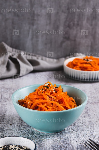 Корейская морковь с семенами кунжута в миске на столе вертикальный вид