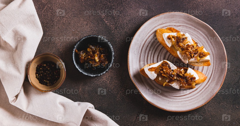 Тосты со сливочным сыром бри и карамельным луком на веб-баннере с видом на тарелку