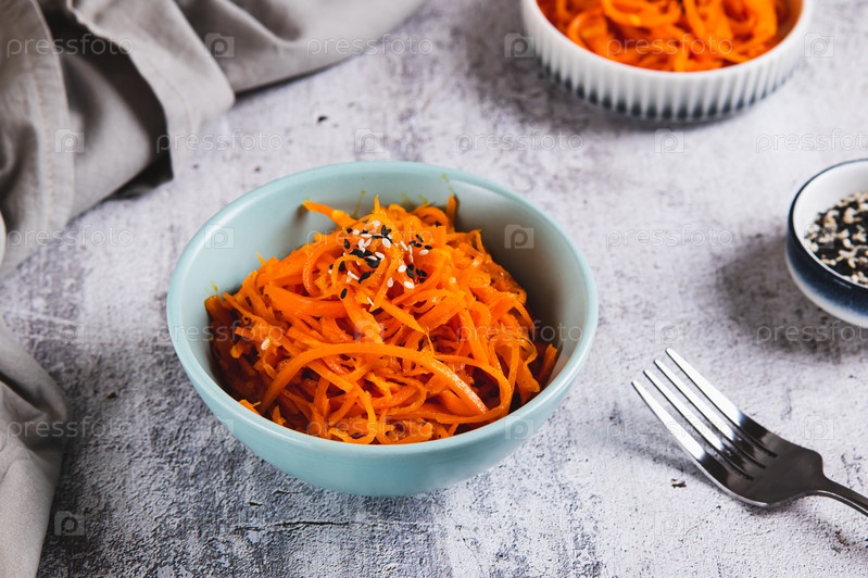 Острая корейская морковь с семенами кунжута в миске на столе