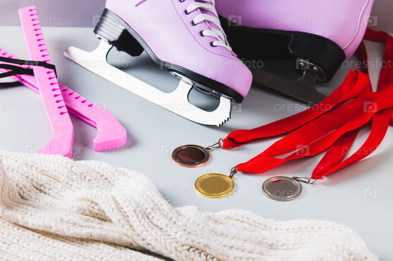 Фигурные коньки, медали, чехлы и шарф на светлом фоне