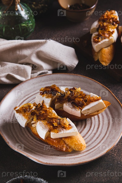 Тосты со сливочным сыром бри и карамельным луком на тарелке на столе вертикальный вид