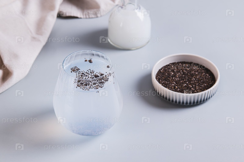 Освежающий напиток из кокосовой воды с семенами чиа в стакане на столе