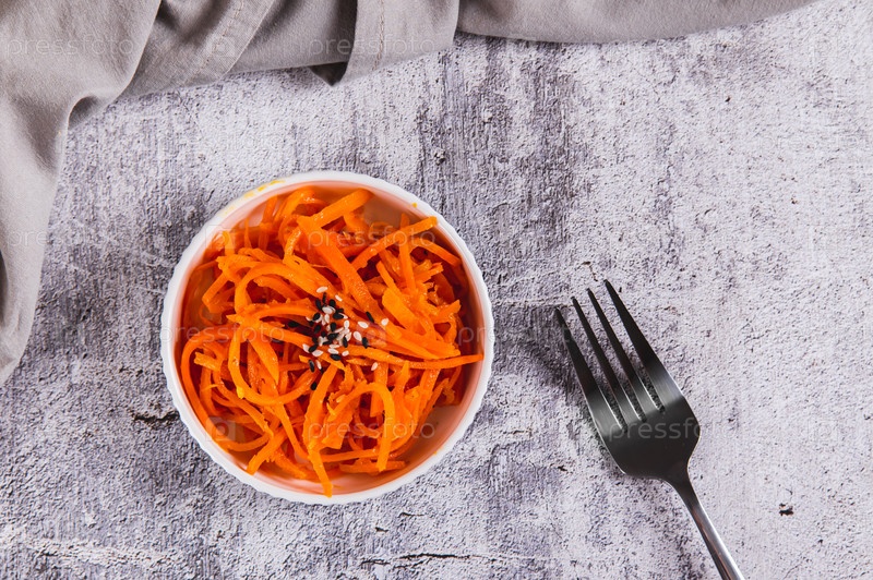 Маринованный корейский салат из моркови на тарелке с видом на стол