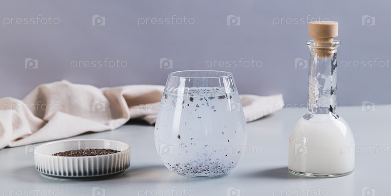 Детокс кокосовая вода с семенами чиа в стакане на столе веб-баннер