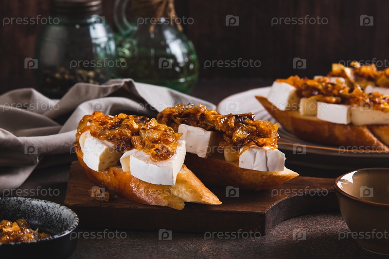 Сэндвичи со сливочным сыром бри и карамельным луком на деревянной доске