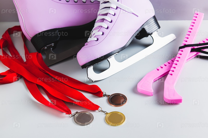 Фигурные коньки, обложки и три медали на светлом фоне