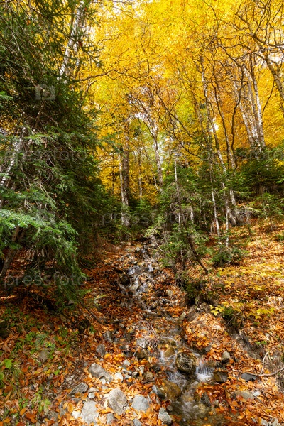 Красочный березовый лес в Ущелье Домбай-Ульген, горы Кавказа осенью