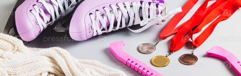 Фигурные коньки, обложки и три медали на светлом фоне веб-баннера