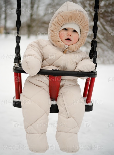 Игривый новорожденный, завернутый в теплый зимний наряд, наслаждается качелями в снегу. Изображение отражает счастье и невинность малыша или ребенка, открывающего для себя зимние развлечения