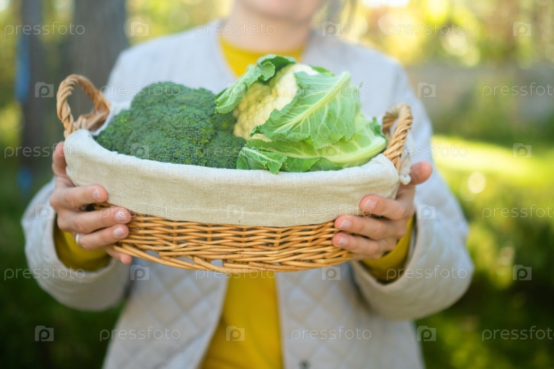 Веселая молодая женщина фермер с корзиной цветной капусты и брокколи. Сезон урожая, домашние овощи, богатая клетчаткой диета, сезонные продукты и вкусные рецепты для здорового питания