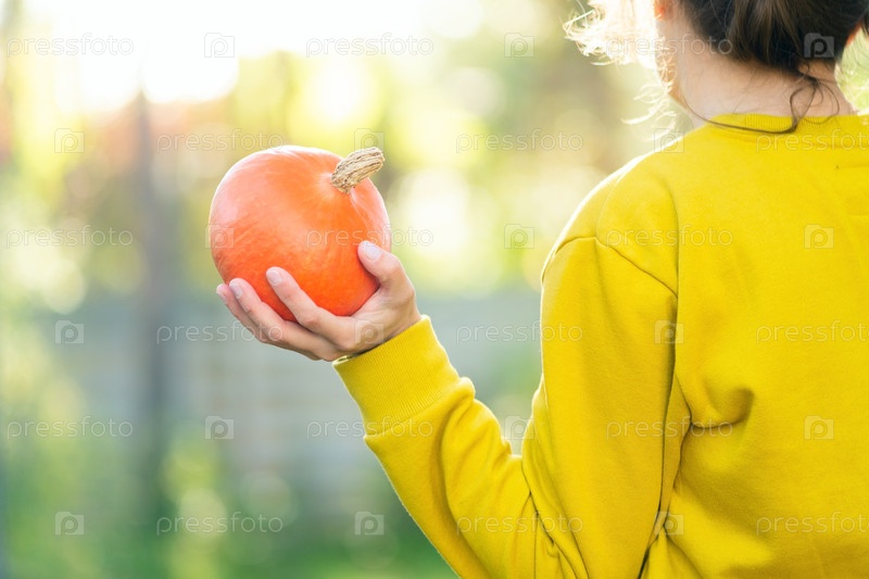 Женщина-фермер держит яркую тыкву со своей фермы. Осенний урожай, органические продукты, здоровый образ жизни, сезонные овощи и натуральная домашняя еда