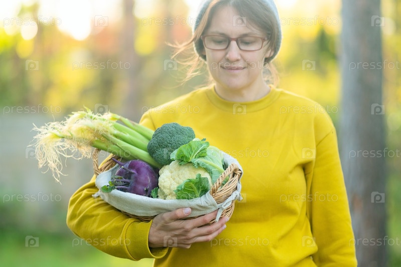 Женщина-фермер с корзиной цветной капусты брокколи Kohlrabi