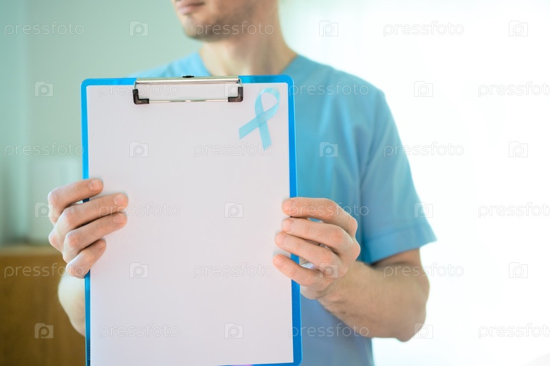 Медицинский работник в форме держит пустой документ с синей лентой. Символ осведомленности о раке предстательной железы в ноябре, концепция ранней диагностики, профилактики и медицинской поддержки