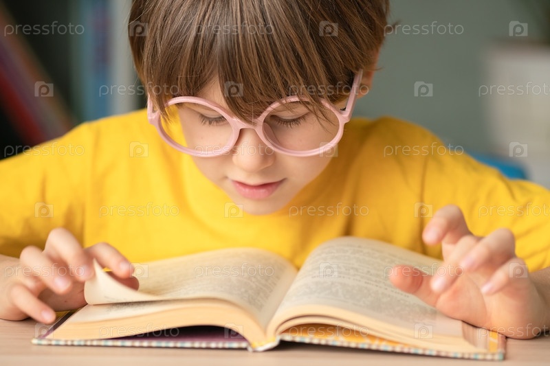 Счастливый ребенок читает книгу за школьным столом