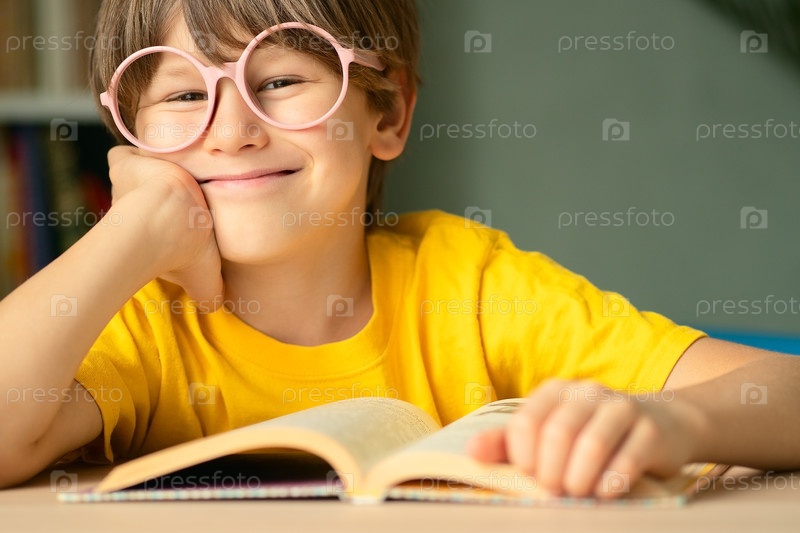 Маленький студент в очках читает книгу за столом