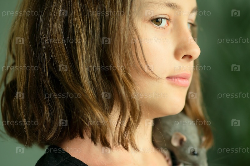 Девушка с дружелюбной домашней крысой, сидящей на ее плече. Пыльно-серое животное демонстрирует доверие. Концепция любви и ответственного владения домашним животным