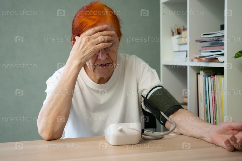Обеспокоенная зрелая женщина, использующая домашнее устройство артериального давления