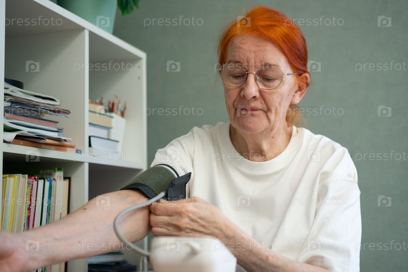 70-летняя женщина, сидящая за столом, надевает на руку манжету цифрового монитора артериального давления. Подготовка к измерению. Сосредоточьтесь на самообслуживании и профилактике