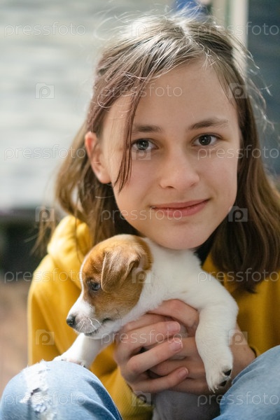 Радостная девочка-подросток улыбается, держа на руках игривого щенка Джека Рассела терьера, проявляя любовь и заботу о своем питомце