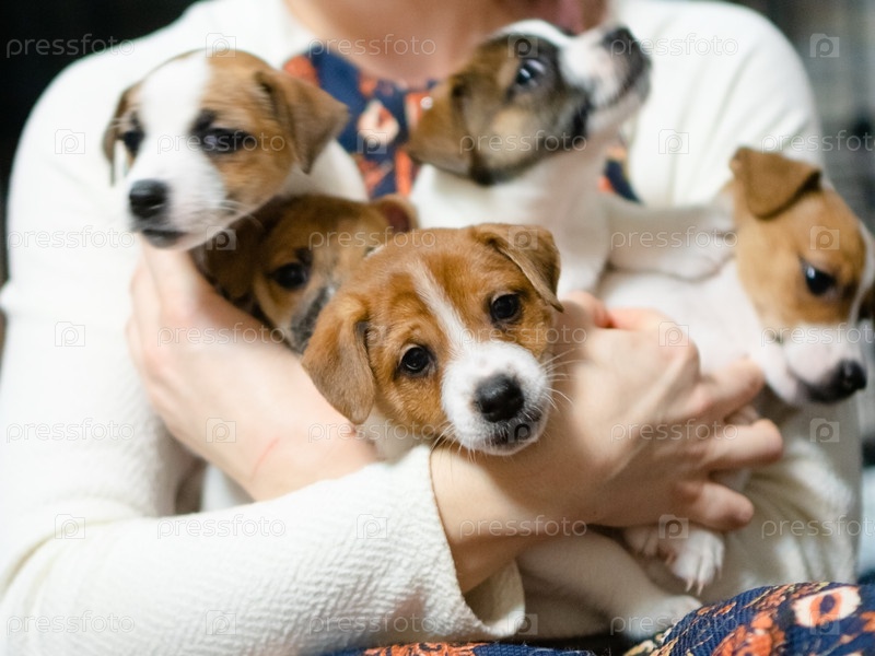 Игривые щенки прижимаются в заботливых человеческих объятиях