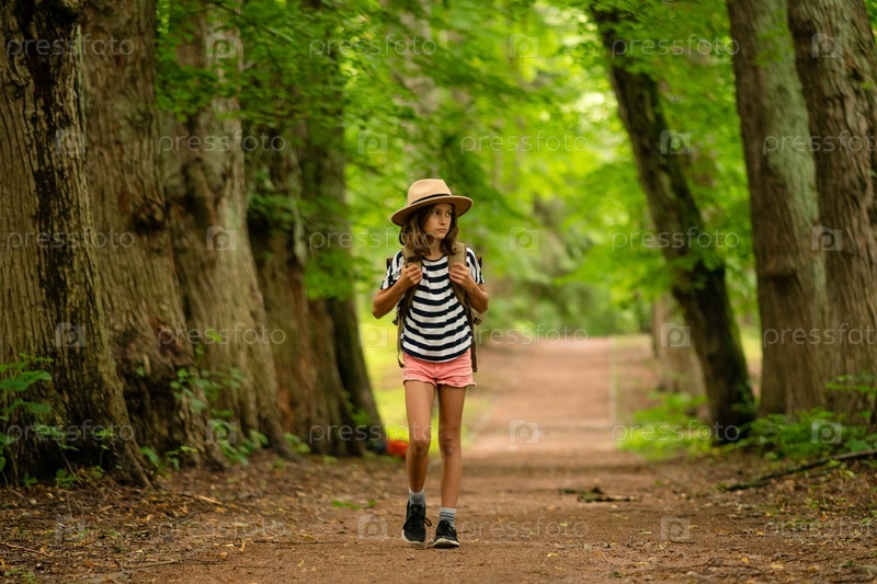 Ребенок с рюкзаком и шляпой идет по лесу, лицом вперед. Летний поход на природу. Радостный момент исследования на открытом воздухе во время праздников и активного отдыха