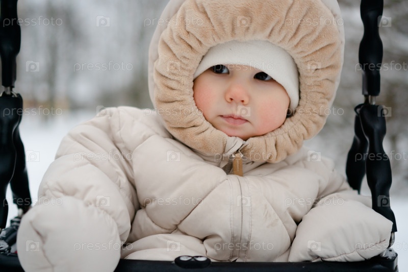 Любопытный ребенок, упакованный в уютный сноуборд, испытывает зимнее веселье на качелях. Сцена захватывает восторг ребенка или малыша, исследующего снежные просторы с удивлением и радостью