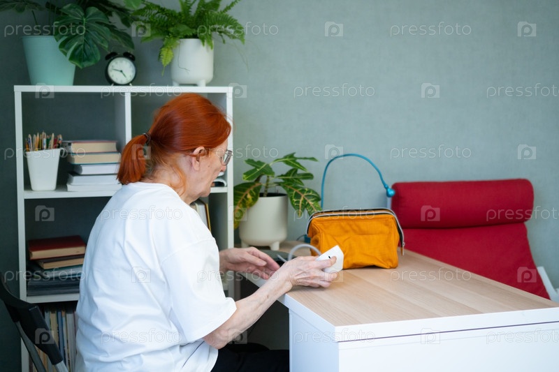Руки пожилой женщины извлекают из сумки прибор для контроля артериального давления. Сфокусируйтесь на руках, сумке и компактном медицинском оборудовании