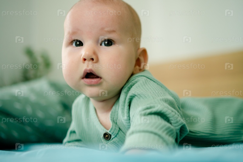 Очаровательный младенец в мягком зеленом пижаме покоится на уютном синем одеяле, олицетворяющем невинность, нежность и мирные моменты раннего детства