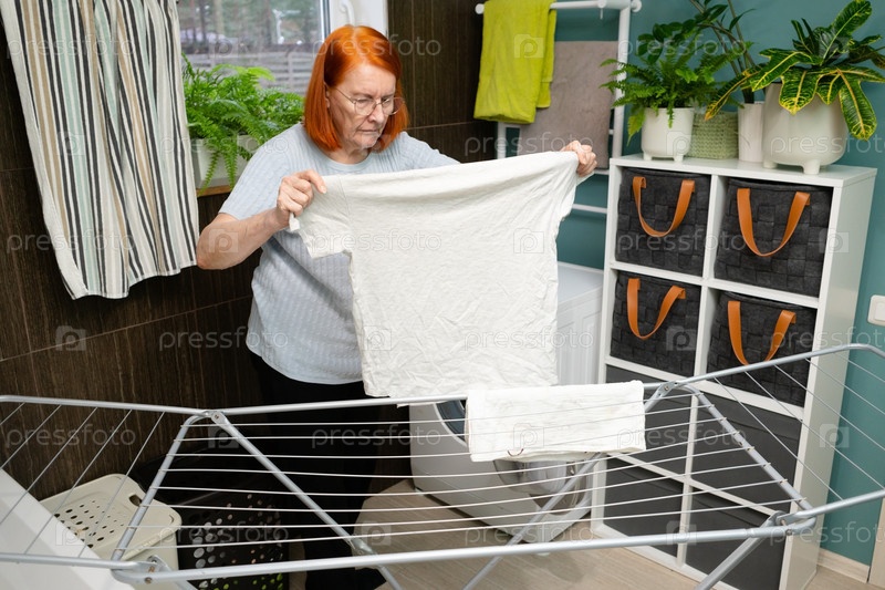 Старшая леди, устраивающая стиральную одежду на стойке сушилки