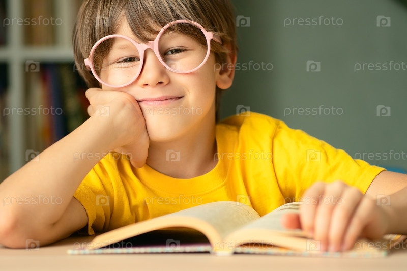 Улыбающийся ученик в очках опирается на руку, читая открытую книгу за столом. Концепция обучения, детское любопытство, раннее образование, обучение, подготовка к школе и развитие молодых умов