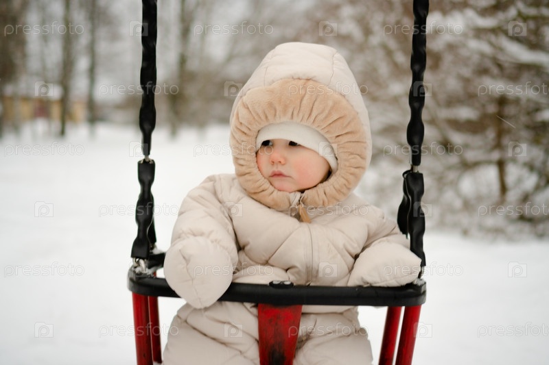 Очаровательный малыш, одетый в теплый сноуборд, наслаждающийся зимними качелями. Уютный наряд и любопытное выражение подчеркивают радость игры на свежем воздухе для ребенка, ребенка или новорожденного в снежную погоду