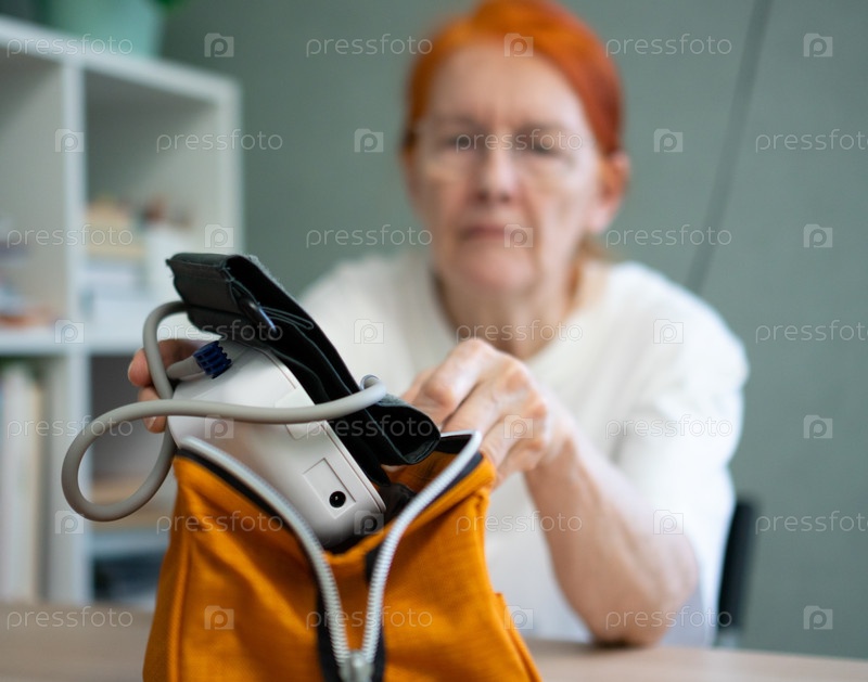 Монитор артериального давления находится в центре внимания, поскольку он помещается в сумку пожилой женщиной. Женщина размыта на заднем плане. Сосредоточьтесь на продукции