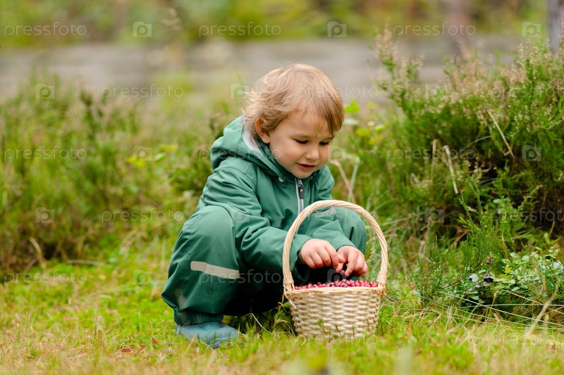 Малыш сидит с тяжелой клюквенной корзиной в осеннем лесу