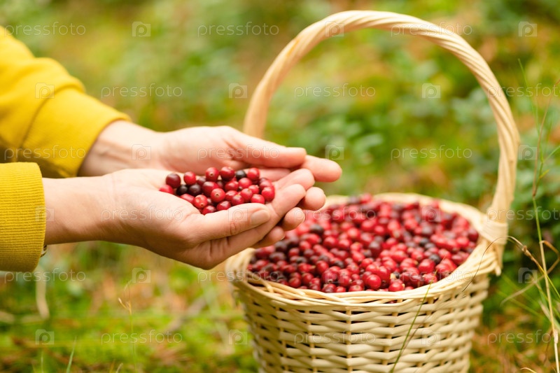 Закройте руку женщины, собирающей клюкву в лесной корзине. Полная корзина ягод, лесной урожай, органические фрукты, витамины, домашние консервы, осенняя природа, спокойный день на свежем воздухе