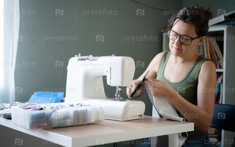 Женщина шьет на машине в своей мастерской
