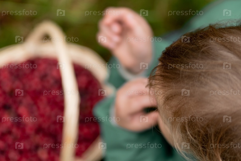 Вид с воздуха детские ладони, держащие клюкву с корзиной и осенним лесом, развитие мелкой моторики и семейное время на свежем воздухе. Сосредоточьтесь на ребенке