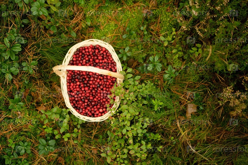 Закройте верхний вид полной корзины с клюквой в лесу. Осенний урожай, полезные ягоды, лесные подарки, витамины во время болезни, самодельное варенье и напитки, мирная прогулка по волшебным осенним лесам