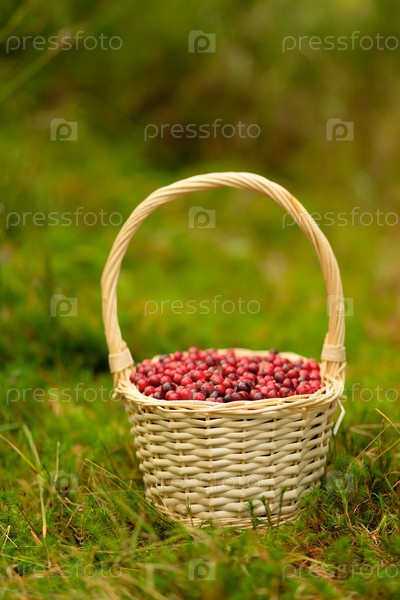 Полная корзина клюквы на лесной почве. Осенний урожай, лесные подарки, полезные ягоды, натуральные витамины, красные фрукты для варенья и напитков, сказочный пейзаж, спокойная погода, спокойное настроение