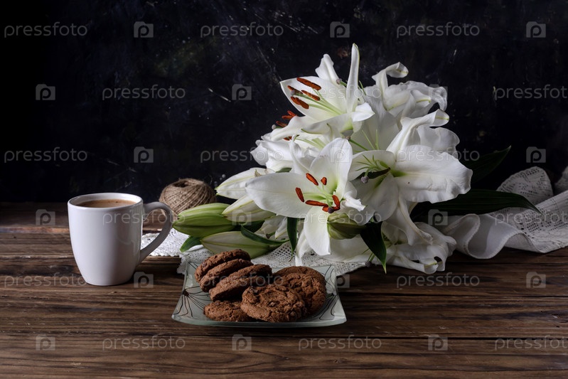 Натюрморт с чашкой кофе, печеньем и белыми лилиями крупным планом