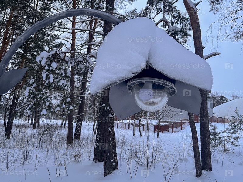 Зимой парк украшает заснеженный фонарь