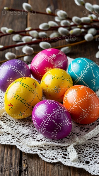 Расскрашеные яйца на праздник Пасхи и веточки вербы на столе