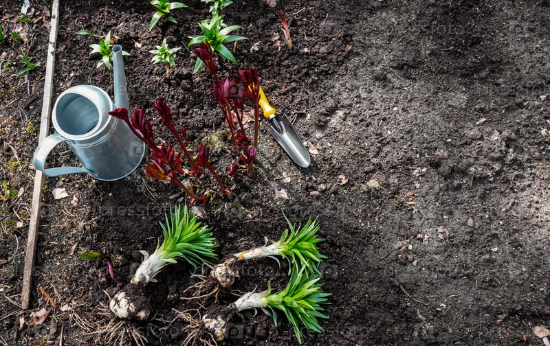 Лилии, готовые к посадке, молодые цветы пиона и садоводческие инструменты в весеннем саду на возделываемой почве