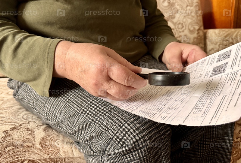 Крупный план пенсионера, читающего коммунальный счет с увеличительным стеклом