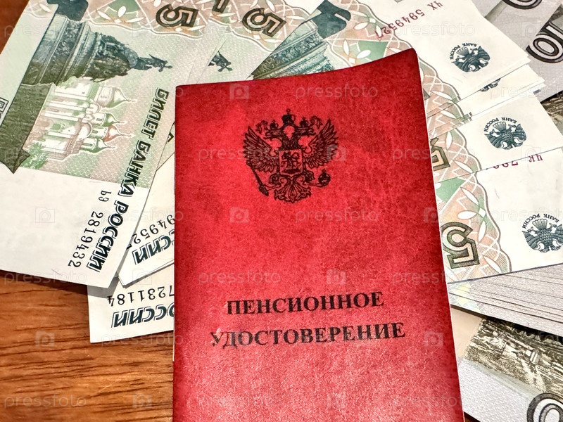 Крупный план пенсионного удостоверения РФ в красном и банкноты номиналом 5 и 10 рублей находятся на столе