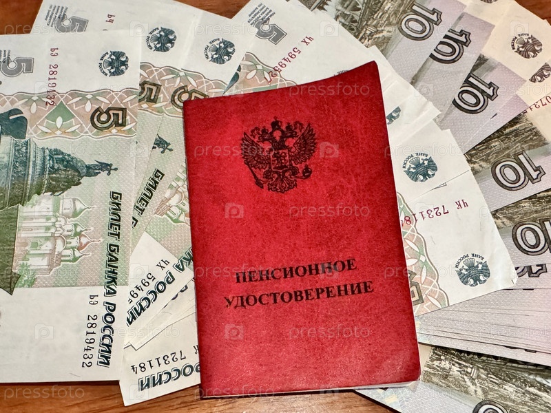Крупный план пенсионного удостоверения РФ в красном и банкноты номиналом 5 и 10 рублей находятся на столе
