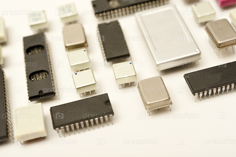 Старые чипсы на белом фоне. Электронные компоненты. Процессоры в металлических и пластиковых корпусах